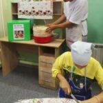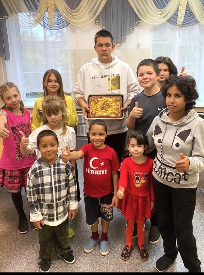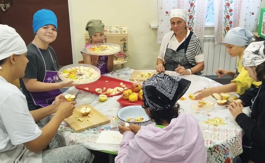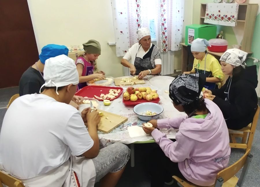 Ребята с удовольствием чистили яблоки, нарезали их дольками и раскладывали на поддоны сушилки. Пока фрукты сушились, участники мастер-класса убирали рабочее место, мыли миски, ножики и подносы. А наши повара за это время успели испечь ароматный яблочный пирог, чаепитие с которым стало прекрасным завершением дня.