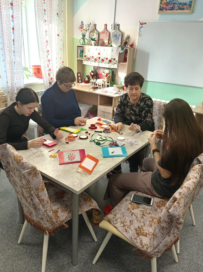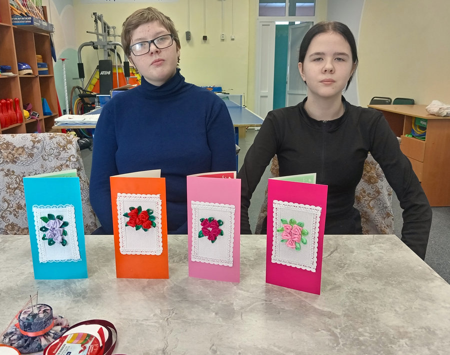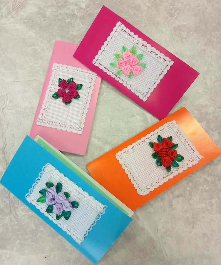 В семейной мастерской «Мост надежды» во всю идет подготовка к весне и весенним праздникам. Сегодня воспитанницы сделали своими руками поздравительную открытку и украсили ее вышивкой из атласных лент.