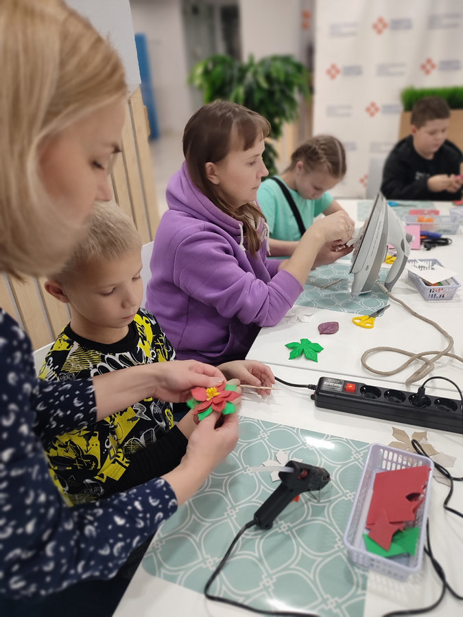 Под руководством опытных педагогов семьи с детьми погрузились в предновогоднюю атмосферу творчества. Участники не только узнали историю и символику «Рождественской звезды» — пуансеттии, но и научились работать с удивительным материалом — фоамираном, раскрывая его пластичные и декоративные свойства.