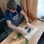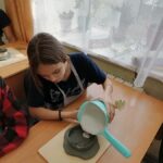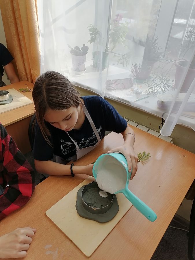 Аккуратно раскатав глину, чтобы сделать из нее молд для будущего панно, ребята приготовились с самому интересному и полному неожиданностей процессу – заливке жидкого гипса в форму. Ожидание окончательного затвердевания массы длится не очень долго, но всегда волнительно, недаром и взрослые, и дети всякий раз удивляются получившемуся результату.