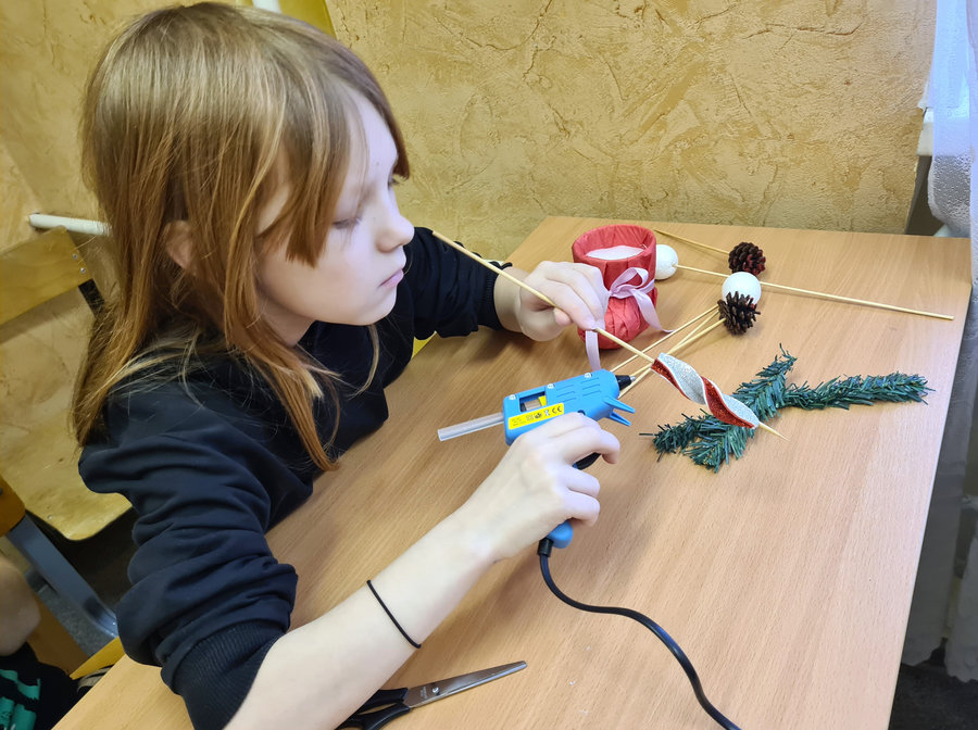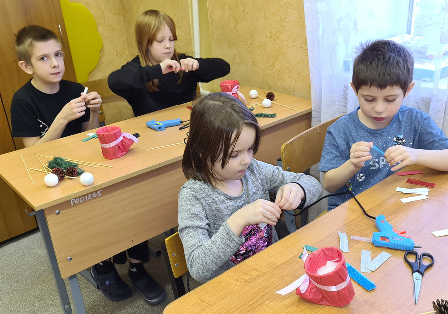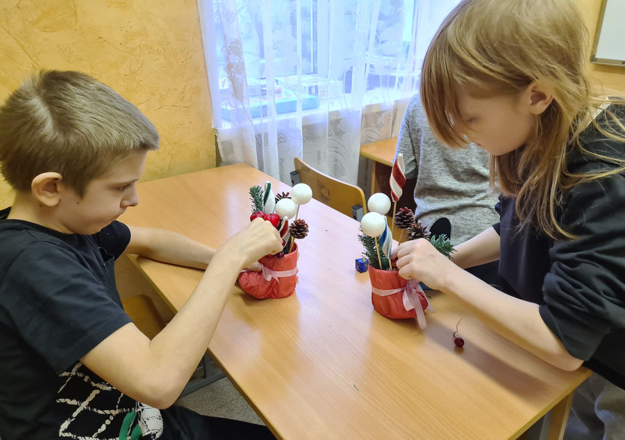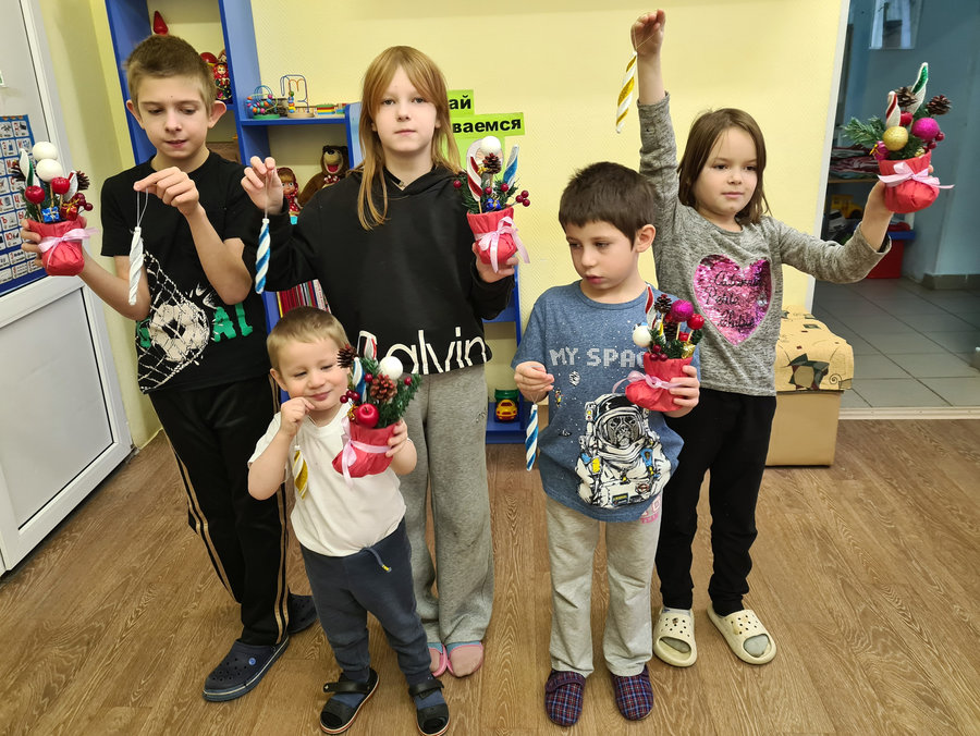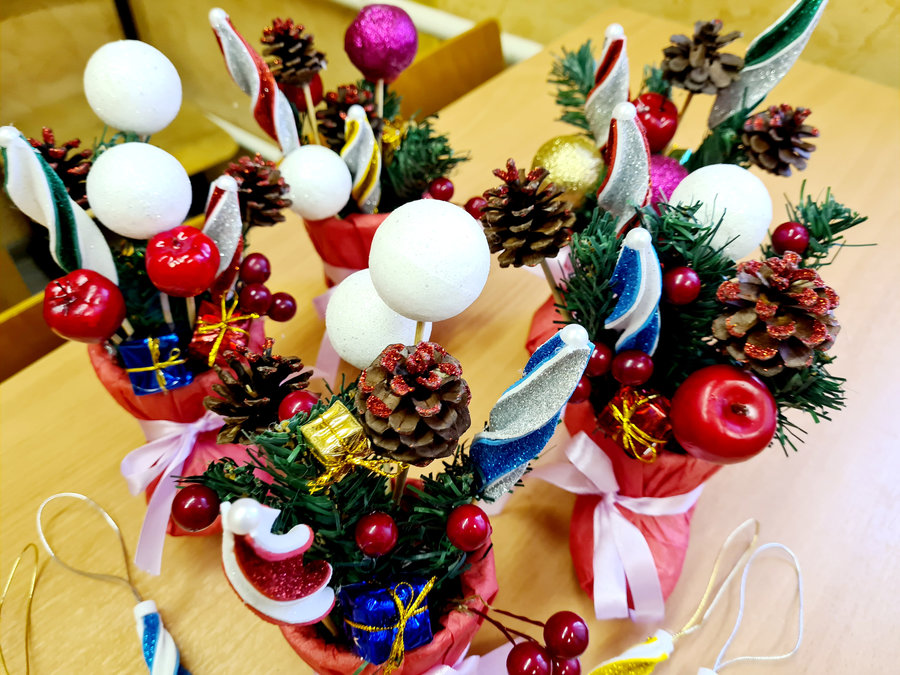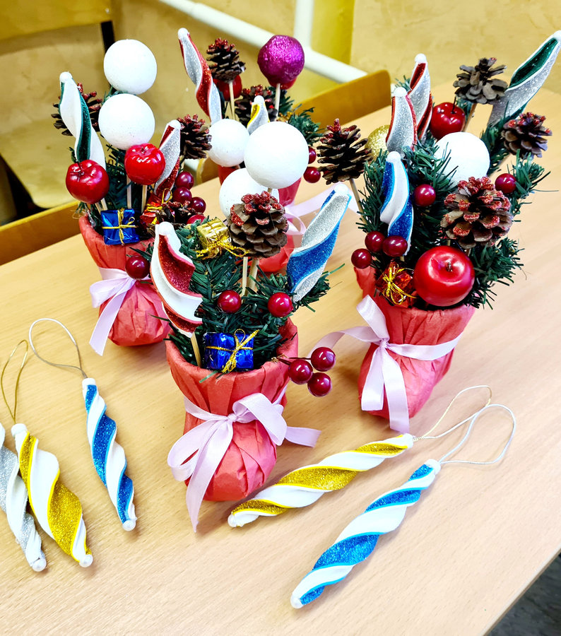 Ребята научились не только делать из предложенного материала блестящие праздничные украшения, но и придумывать с ними индивидуальные композиции, добавляя по мере необходимости те или иные элементы, чтобы яркая поделка смотрелась привлекательно и нарядно, радуя взгляд, создавая атмосферу Нового года.
